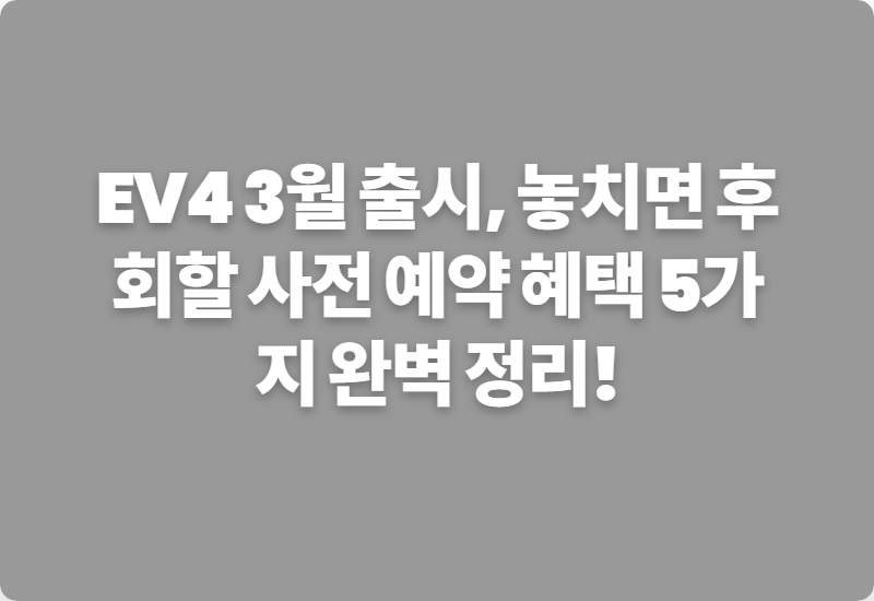 드디어 그날이 오고 있습니다! 전기차 시장의 판도를 뒤흔들 차세대 주자, EV4가 드디어 3월 출시를 앞두고 사전 예약 혜택을 공개한다는 소식, 다들 들으셨나요?저처럼 새로운 전기차 소식에 귀가 쫑긋하는 분들이라면 이번 EV4의 등장이 정말 설렐 거예요. 그렇죠?오늘은 저와 함께 EV4의 매력은 물론, 우리가 가장 궁금해하는 사전 예약 특별 할인과 혜택들을 꼼꼼하게 파헤쳐 보려고 합니다. 과연 어떤 통 큰 프로모션들이 우리를 기다리고 있을까요?지갑은 얇아도 현명한 소비를 꿈꾸는 이 시대의 소비자들을 위해, 제가 직접 발품 팔아 알아본 EV4 사전 예약 정보, 지금 바로 공개합니다!미래를 이끌 EV4, 어떤 모습으로 올까? EV4는 단순한 이동 수단을 넘어선, 미래 모빌리티의 방향성을 제시하는 모델로 기대..