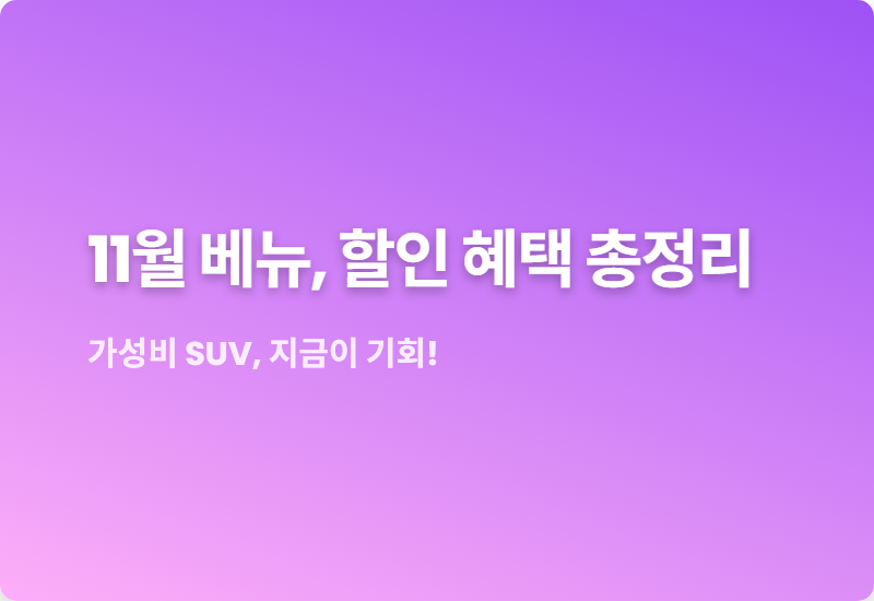 가성비 SUV, 지금이 기회!안녕하세요, 여러분.오늘은 사회초년생과 실속파 운전자들의 든든한 동반자, 현대 베뉴의 11월 프로모션 소식을 들고 왔습니다.합리적인 가격에 알찬 구성으로 사랑받는 베뉴를 더욱 저렴하게 구매할 수 있는 절호의 기회, 저와 함께 꼼꼼히 살펴보시죠.베뉴 기본 할인 혜택11월에는 생산월에 따라 할인 혜택이 달라지는 점, 다들 알고 계셨나요?.마치 갓 나온 빵처럼 따끈따끈한 신차도 좋지만, 조금만 눈을 돌리면 숨겨진 보석 같은 할인 혜택을 만날 수 있답니다.특히 특정 생산월 재고에 대해서는 파격적인 할인이 제공되니, 재고 현황을 잘 확인하는 것이 중요해요.아래 표에서 생산월별 할인 금액을 확인하고, 나에게 가장 유리한 조건을 찾아보세요.생산월할인 금액비고2024년 8월 이전100만원재..
