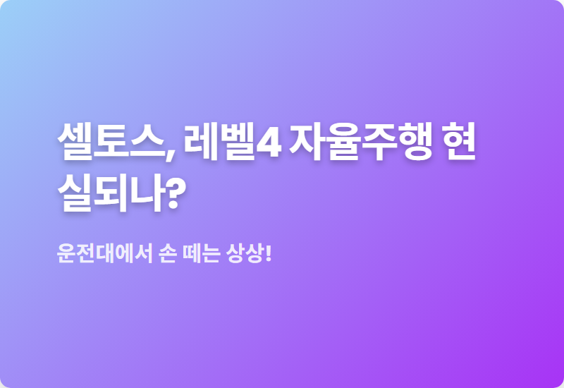 상상만으로도 가슴이 두근거리지 않나요?.SF 영화 속에서나 보던 자율주행 기술이 어느새 우리 곁으로 성큼 다가왔습니다.특히 인기 소형 SUV인 셀토스에 레벨 3, 나아가 레벨 4 자율주행 기술이 탑재될 수 있다는 전망이 나오면서 많은 사람들의 기대를 한 몸에 받고 있답니다.자율주행, 레벨 3와 4 차이점사실 자율주행이라고 해서 다 같은 게 아니라는 사실, 알고 계셨나요?.마치 우리네 인생처럼 단계가 있답니다.지금 대부분의 신차에 적용된 건 '레벨 2' 수준으로, 운전자의 개입이 필수적인 단계예요.하지만 '레벨 3'부터는 이야기가 완전히 달라집니다!.고속도로 같은 특정 조건에서는 자동차가 스스로 운전하고, 운전자는 잠시 운전대에서 손을 뗄 수 있게 되죠.물론 시스템이 요청하면 즉시 운전대를 잡아야 하는 '..