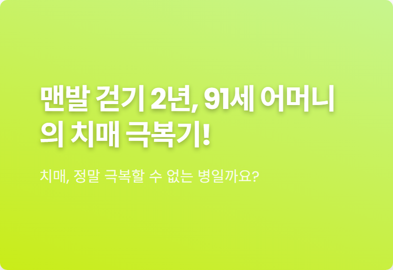 2년 전만 해도 중증 치매로 가족을 알아보지 못하고 대소변도 가리지 못하시던 91세 어머니가 맨발 걷기 2년 만에 증세가 사라진 기적 같은 사연, 지금 바로 시작합니다.