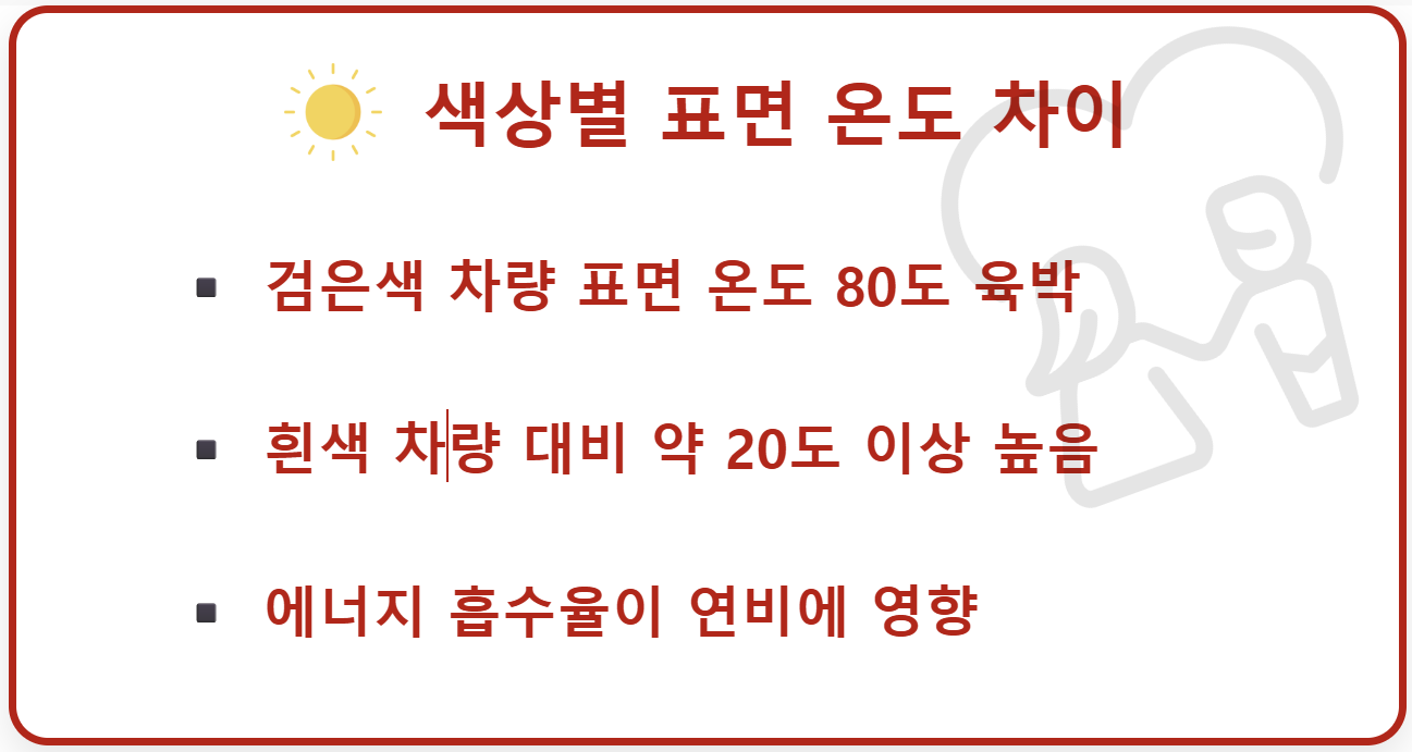 위 표에서 보시는 것처럼 색상에 따른 물리적 온도 차이는 명확하며 이는 곧 차량 운영 비용으로 직결됩니다.