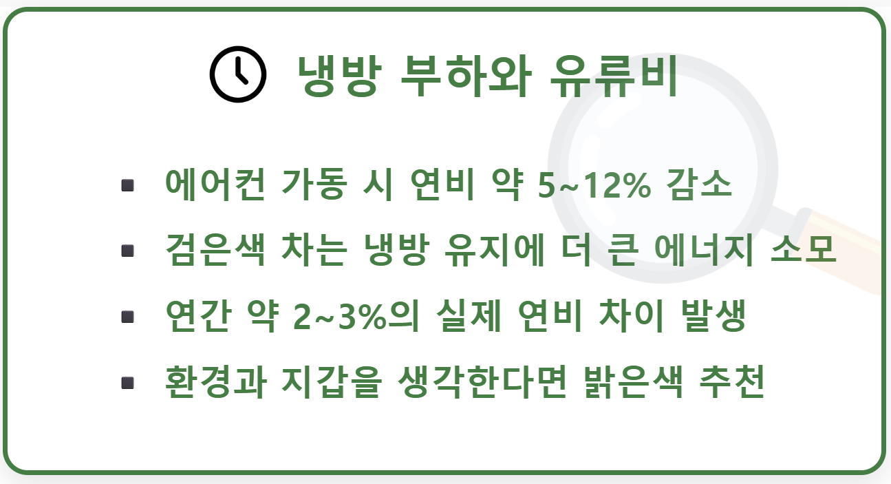 물론 겨울에는 반대로 어두운색이 유리할 수 있지만, 히터는 엔진의 폐열을 이용하기 때문에 연비에 미치는 영향이 에어컨보다 훨씬 작습니다.